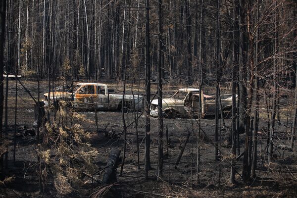 Burnt out trucks from a wildfire sit on a property near Drayton Valley, Alta. on May 10, 2023.JASON FRANSON/The Canadian Press