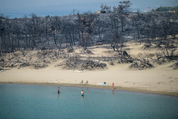 A woman enters the sea from a beach where wildfires destroyed the woods in the southern part of the Greek island of Rhodes, on July 27, 2023.ANGELOS TZORTZINIS/Getty Images