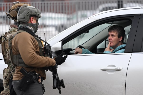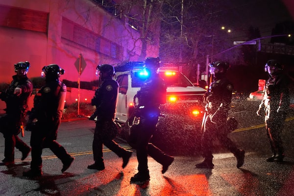 A damaged car is seen as law enforcement officials work the scene following reports that federal immigration officers shot and wounded people in Portland.Jenny Kane/The Associated Press