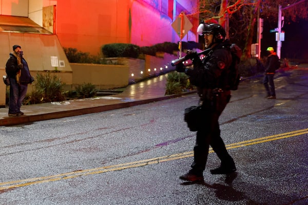 A Portland police riot squad member takes position as demonstrators gather outside the Portland ICE facility on Thursday.John Rudoff/Reuters
