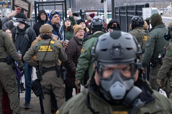 Protesters confront federal agents outside the Bishop Henry Whipple Federal Building in Minneapolis.Tom Baker/The Associated Press