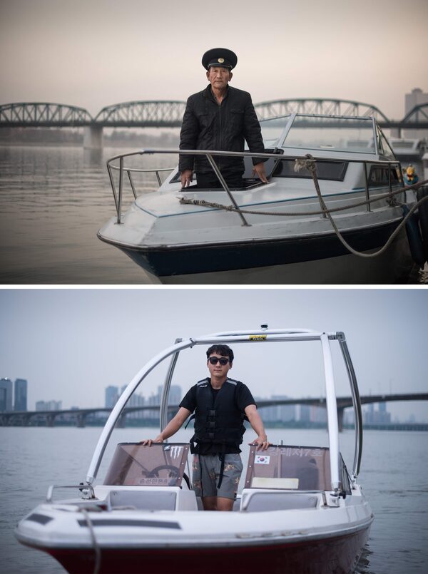 Sailor Kim Il Soo (top) poses on his tourist boat on the Taedong river in Pyongyang. Kim Kun Ho (25, bottom) poses on his watersports boat on the Han river in Seoul.ED JONES/AFP/Getty Images
