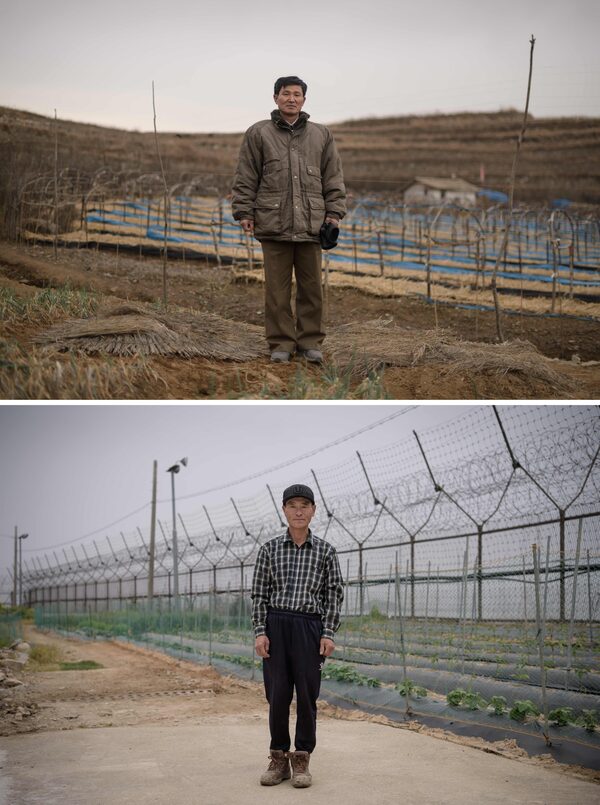 Ginseng farm manager Kim Young Guk (top) poses in a ginseng field outside Kaesong. Small-holding farmer Hwang In-suk (bottom) poses before the fence of the Demilitarized Zone (DMZ) and skyline of North Korea (rear C) in his back yard on Gyodong island, west of Seoul.ED JONES/AFP/Getty Images
