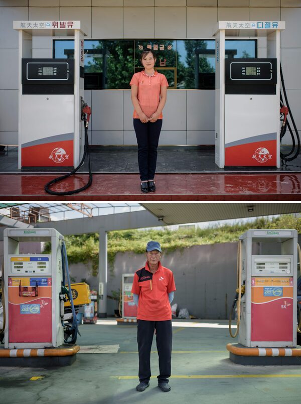 Petrol pump attendant Kim Su Hyang (18, top) poses at the gas station where she works on the Pyongyang to Nampho road. South Korean petrol pump attendant poses at a gas station near Goyang on September 15, 2017.ED JONES/AFP/Getty Images
