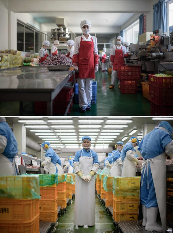 Hong Kum Ju (27, top) poses at the food factory where she works, near North Korea's eastern port city of Wonsan. Kim Si-eun (49, bottom) poses at the Spam factory where she works in Jincheon, south of Seoul.ED JONES/AFP/Getty Images