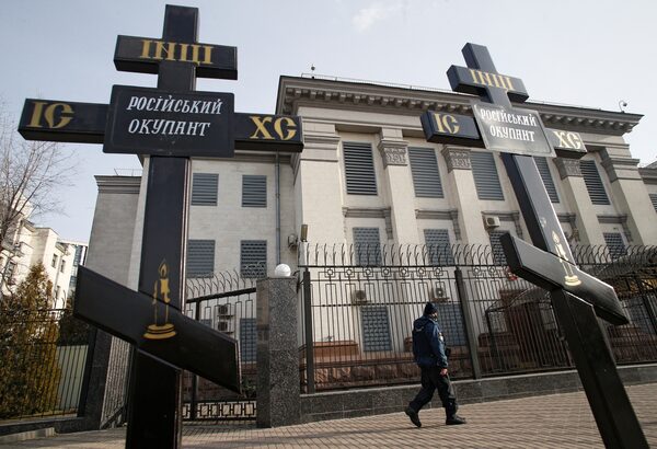 Crosses installed during a protest against Russia's actions in the separatist-controlled Donbas region of Ukraine are seen outside the Russian embassy in Kyiv.VALENTYN OGIRENKO/Reuters