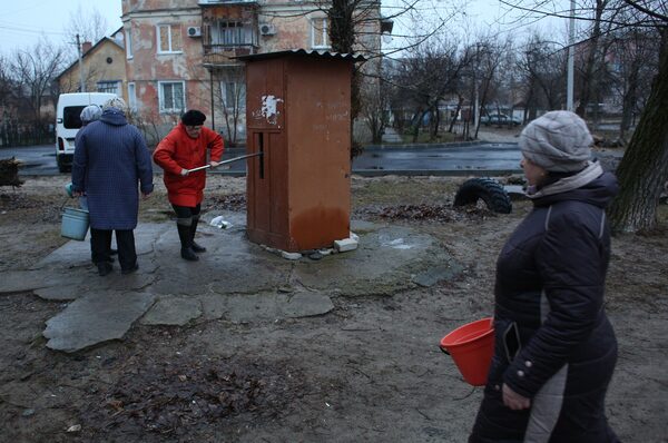Citizens collect water from a well in the town of Schastia, near the eastern Ukraine city of Lugansk, on February 23, 2022, after the town's pump stations were knocked out of power by shelling.ANATOLII STEPANOV/AFP/Getty Images
