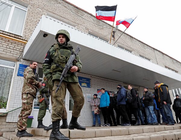 Militants of the self-proclaimed Donetsk People's Republic stand outside a military mobilization point in the separatist-controlled city of Donetsk, Ukraine.ALEXANDER ERMOCHENKO/Reuters