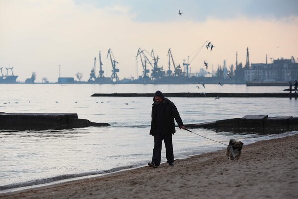 A man walks a dog along a coast of the Sea of Azov in Ukraine's industrial port city of Mariupol.ALEKSEY FILIPPOV/AFP/Getty Images