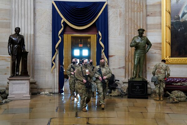 Members of the National Guard walk through the Rotunda of the US Capitol in Washington.SAUL LOEB/AFP/Getty Images
