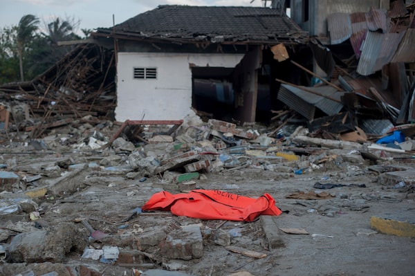The body of a tsunami victim waits for evacuation in Palu, Central Sulawesi.Fauzy Chaniago/The Associated Press