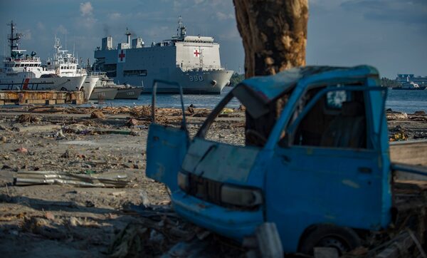An Indonesian navy hospital warship is moored in Palu, six days after a strong earthquake triggered tsunami.BAY ISMOYO/AFP/Getty Images