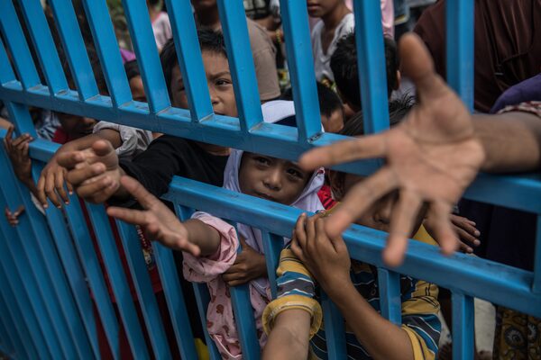 Children and adults grab food being distributed by the military in Palu.Carl Court/Getty Images