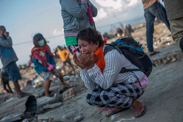 Residents react as rescuers recover the body of a tsunami victim in Palu, Central Sulawesi.Fauzy Chaniago/The Associated Press
