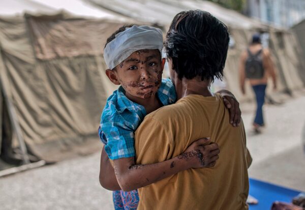 A boy injured during the tsunami is carried by his relative at a makeshift hospital in Palu.Fauzy Chaniago/The Associated Press
