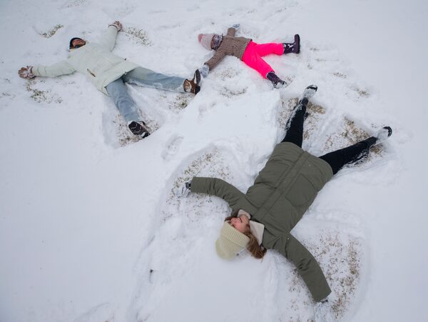 Sisters, Ava and Ellie Johnson and their niece, Novie Quinones, make snow angels at Heritage Park in League City, Texas.Stuart Villanueva/The Associated Press
