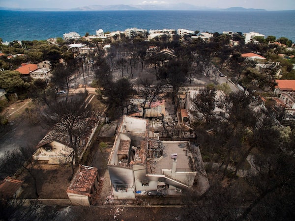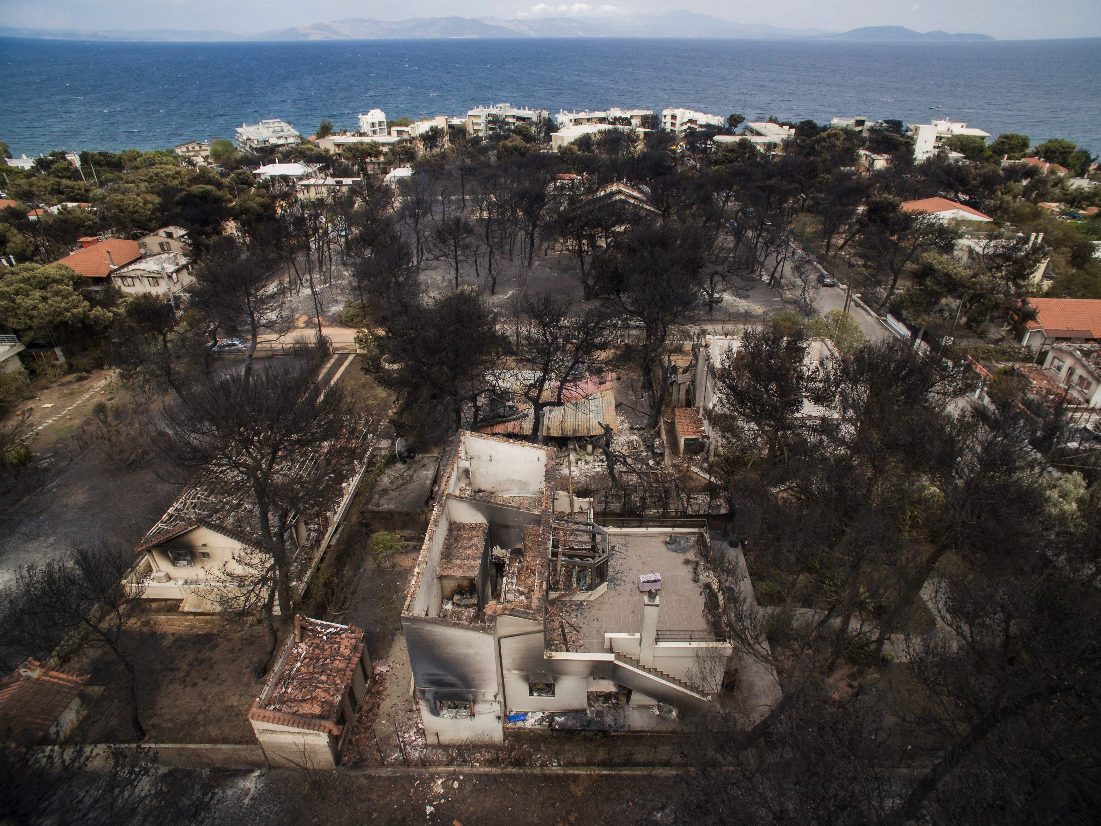 An aerial view shows burnt houses following a wildfire in the village of Mati.SAVVAS KARMANIOLAS/AFP/Getty Images