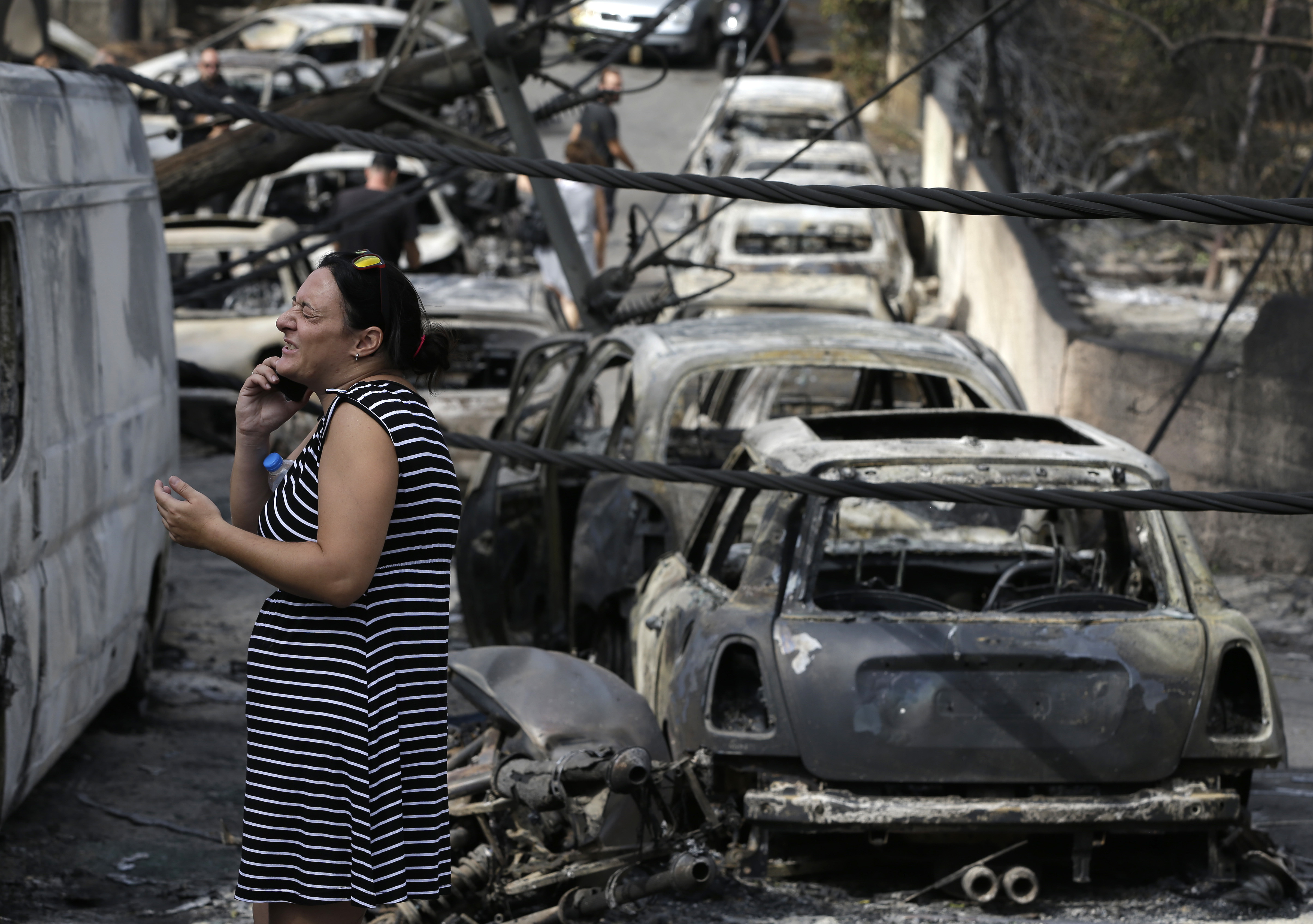 A woman reacts as she stands amid the charred remains of burned-out cars in Mati.Thanassis Stavrakis/The Associated Press