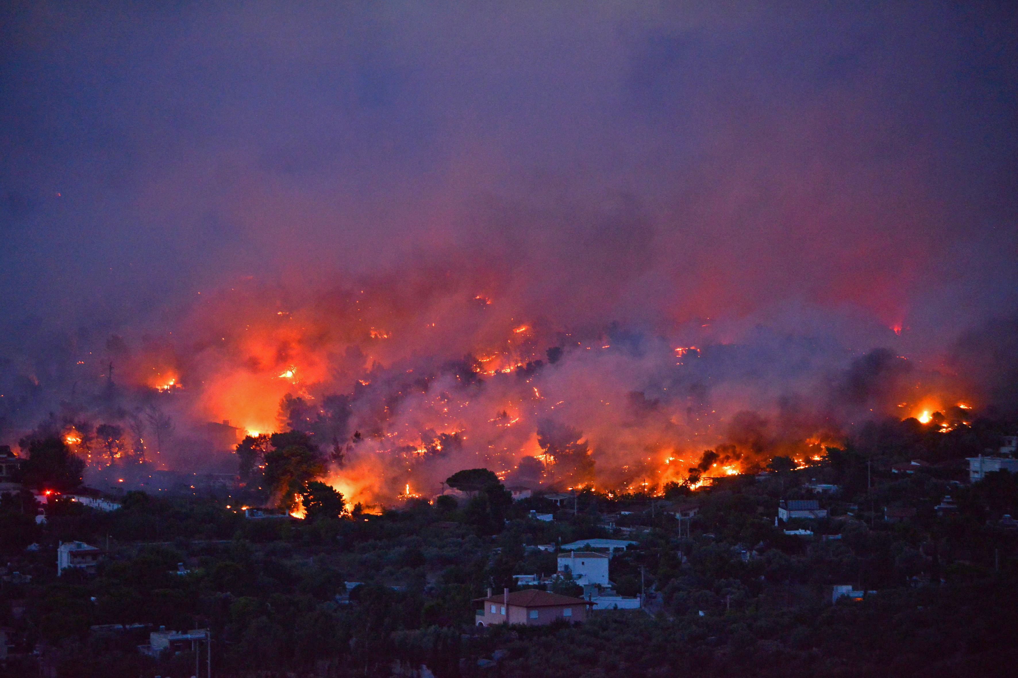 Flames rise as a wildfire burns in the town of Rafina, near Athens.ANGELOS TZORTZINIS/AFP/Getty Images