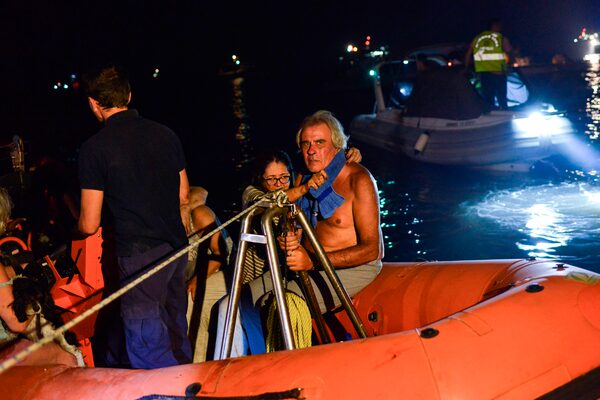 Rescuers help local people evacuate the village of Mati during a wildfire.ANGELOS TZORTZINIS/AFP/Getty Images