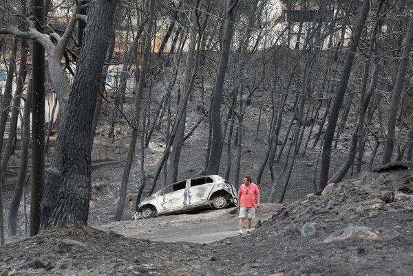 A man stands amongst the charred trees and a burned-out car near the village of Neos Voutzas near Athens, Tuesday, July 24th.Yorgos Karahalis/The Associated Press