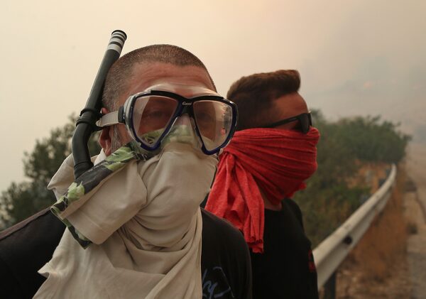 People cover their faces from the smoke that fills the sky near Kineta, west of Athens, after roads were blocked due to forest fires.Thanassis Stavrakis/The Associated Press
