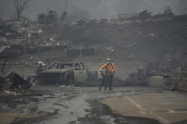 A man walks his bike among the ruins left behind by the Palisades Fire in the Pacific Palisades neighborhood of Los Angeles.Damian Dovarganes/The Associated Press