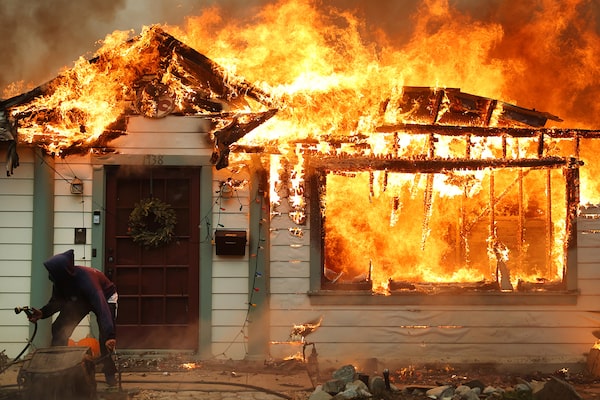 A person turns on a garden hose in an effort to save a neighbouring home from catching fire during the Eaton Fire in Altadena.Mario Tama/Getty Images