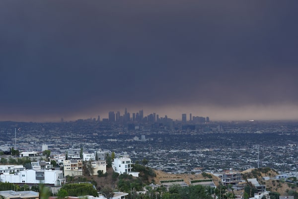 Thick smoke hangs over the skyline of the downtown area in Los Angeles, California.Tyler Transki/Reuters