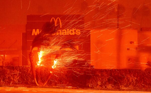 A McDonald's restaurant is showered in embers during the Eaton fire in Pasadena, California.JOSH EDELSON/AFP/Getty Images