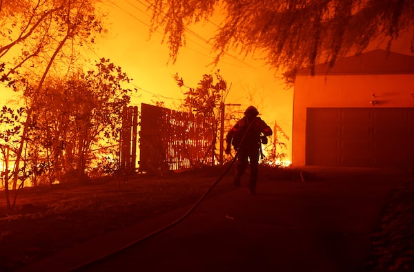 Firefighters battle the Palisades Fire as it burns a structure in the Pacific Palisades neighbourhood of Los Angeles.Etienne Laurent/The Associated Press