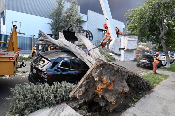 Workers attempt to remove a tree that fell on a car due to high winds in Glendale, California.ROBYN BECK/AFP/Getty Images