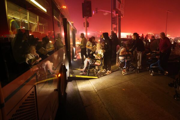 Residents of a senior center are evacuated and loaded into a bus as the Eaton Fire approaches in Altadena.Ethan Swope/The Associated Press