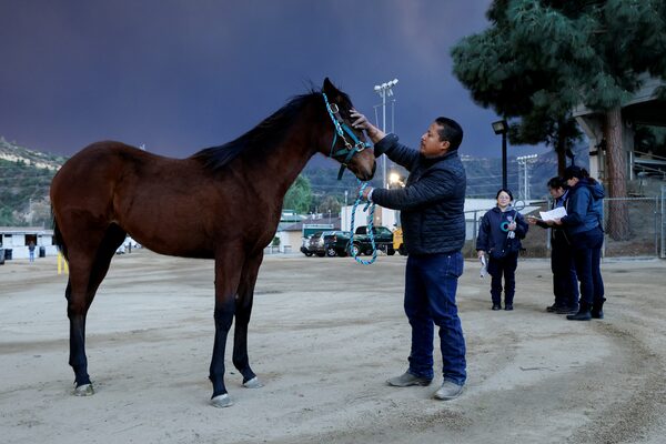 Bardo Calvo calms a horse as large animals are evacuated at the Los Angeles Equestrian Center in Burbank, California.Carlin Stiehl/Reuters