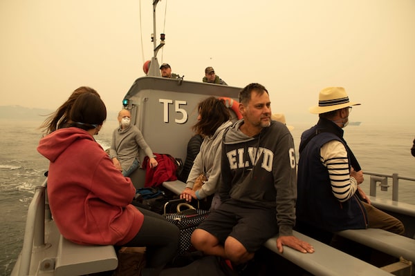 People are evacuated from Mallacoota, Victoria on a landing craft to MV Sycamore on January 3.SHANE CAMERON/AFP/Getty Images