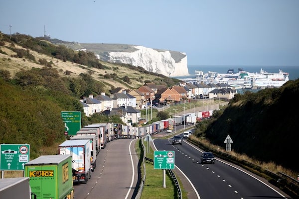Lorries queue up on the road A20 in Kent, as a result of the road closure caused by the Insulate Britain protest at the entrance of Port of Dover, U.K.HENRY NICHOLLS/Reuters