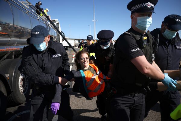 Police officers detain a protestor of the group "Insulate Britain" at the entrance to the Port of Dover, U.K..HENRY NICHOLLS/Reuters