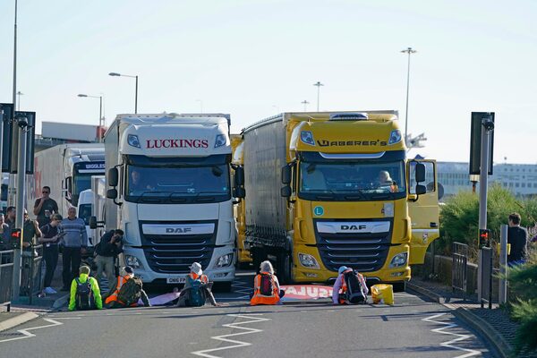 Protesters from Insulate Britain block the A20 which provides access to the Port of Dover, in Kent, U.K.. The environmental activists have moved location after been banned from campaigning on the M25 motorway in London.Gareth Fuller/The Associated Press