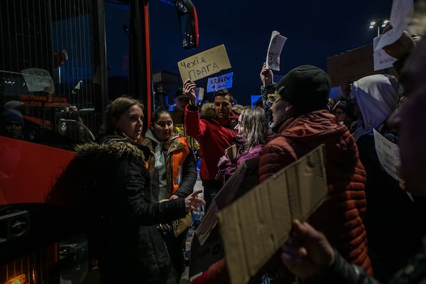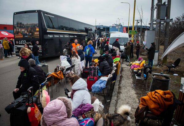 People fleeing from Ukraine are received by authorities upon arriving in Ubla, Slovakia, on Feb. 26.RADOVAN STOKLASA/Reuters
