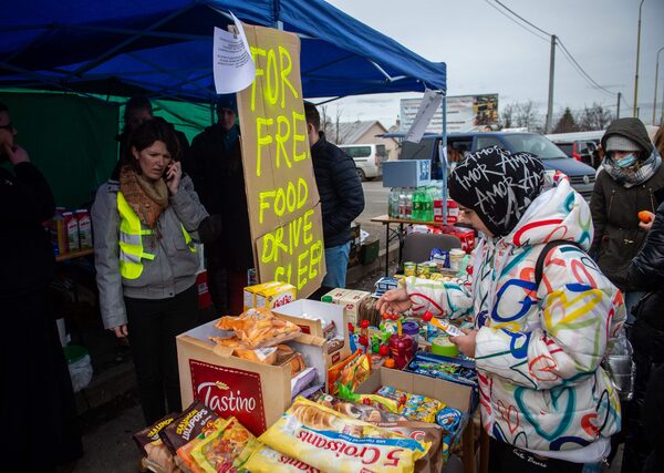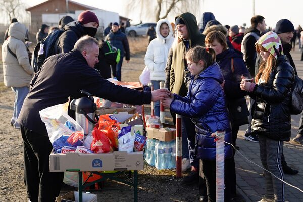 People who have recently crossed the border are offered hot food and drink in Medyka, Poland, on Feb. 26.BRYAN WOOLSTON/Reuters