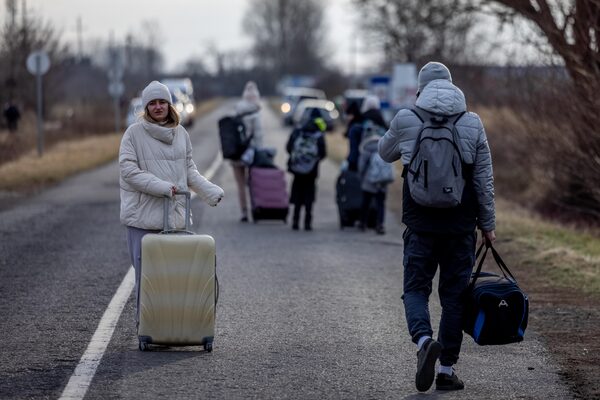 Ukrainian women and children cross the border into Poland at the Korczowa-Krakovets border crossing on Feb. 26.JANEK SKARZYNSKI/AFP/Getty Images