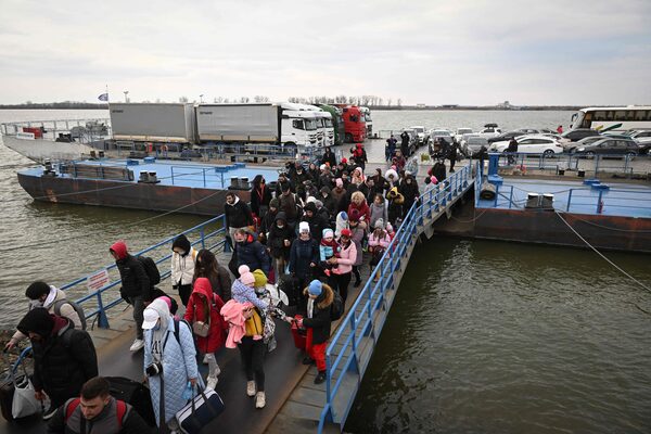 People coming from Ukraine descend from a ferry boat to enter Romania after crossing the Danube river at the Isaccea-Orlivka border crossing between Romania and Ukraine on Feb. 26.DANIEL MIHAILESCU/AFP/Getty Images