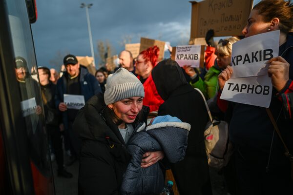 A woman holds her baby as she arrives by bus to a supermarket parking lot at the Polish-Ukrainian border crossing in Przemysl, Poland on Feb. 26.Omar Marques/Getty Images