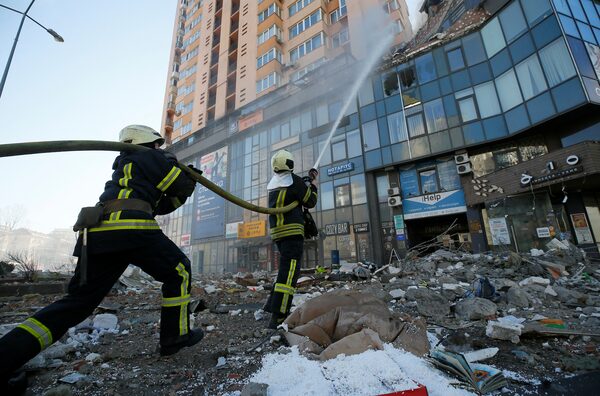 Firefighters extinguish fire in an apartment building damaged by recent shelling in Kyiv on Feb. 26.GLEB GARANICH/Reuters