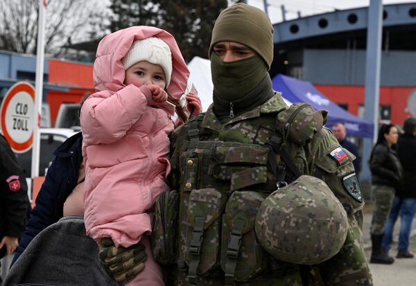 A member of the Slovak Armed Forces carries a child who arrived in Slovakia with her family after fleeing Ukraine on Feb. 26.RADOVAN STOKLASA/Reuters