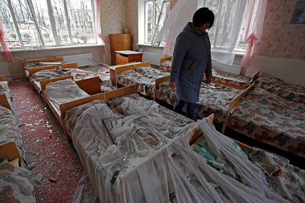 A teacher walks through a room at a kindergarten, which locals said was damaged by recent shelling, in the separatist-controlled city of Donetsk, Ukraine on Feb. 26.ALEXANDER ERMOCHENKO/Reuters