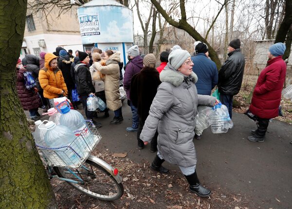 People stand in line to buy drinking water in the separatist-controlled city of Donetsk, Ukraine on Feb. 26.ALEXANDER ERMOCHENKO/Reuters