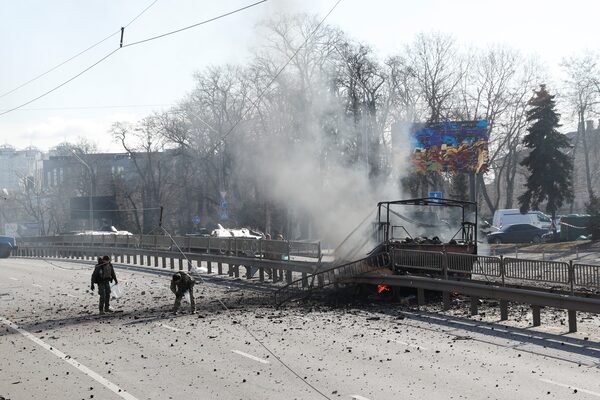 Ukrainian servicemen inspect a damaged vehicle, at the site of a fighting with Russian troops in Kyiv on Feb. 26.VALENTYN OGIRENKO/Reuters
