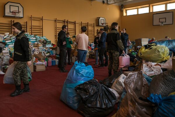 A Ukrainian woman and a child pick from donated supplies at a primary school sports hall in Przemysl, Poland, that has been converted into a temporary shelter on Feb. 26.Omar Marques/Getty Images