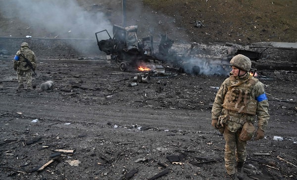 Ukrainian servicemen walk by a damaged vehicle, at the site of a fighting with Russian troops in Kyiv, after Russia launched a massive military operation against Ukraine, on Feb. 26.VALENTYN OGIRENKO/Reuters